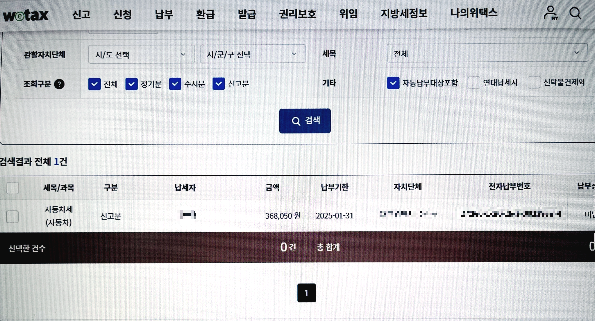 3. [1]표시된 지방세를 클릭하면 납부해야 할 세금리스트가 뜹니다.
