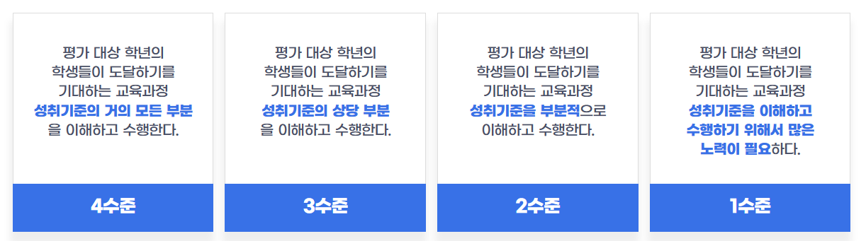 - 인지적 특성 : 교과 영역별 성취수준(1~4수준)/ 성취수준별 학업 성취 특성/ 교과 영역별 및 역량별 성취율